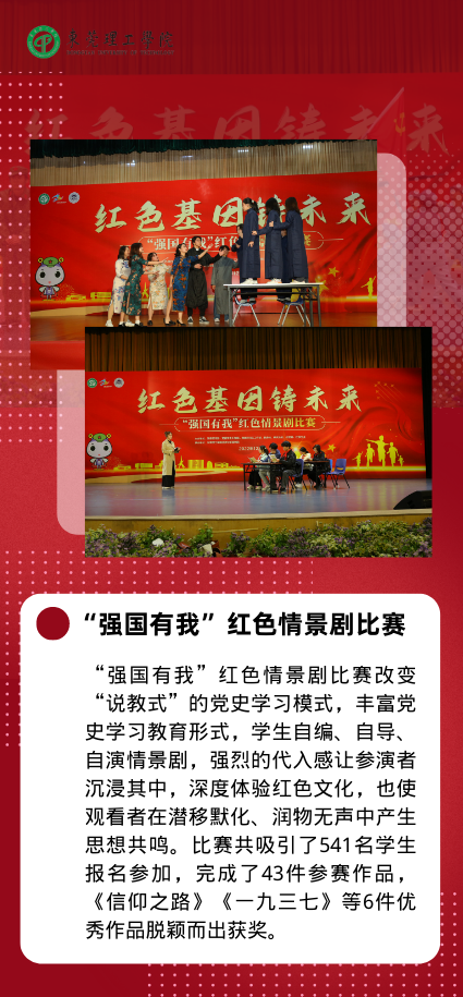 创新手段,提高党史学习教育实效。大学生艺术党课、“强国有我”红色情景剧比赛、致敬科学家主题教育活动等项目,立足于大学生群体特点,创新活动形式,采用文艺表演、自编剧目、演说结合等手段,再现革命历史、展现人物风华、普及科学家精神,促进党史学习教育有声有色、入脑入心。刚刚转为正式党员的学生艺术团团长、2020级机械设计1班黄子洋表示,参加艺术党课的策划组织与录制是一件非常有意义的实践,很好地诠释了党课的主题“青春心向党,红色映初心”。