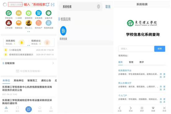(1)在i莞工APP搜索栏输入“系统检索”,并在相应搜索栏输入所要查询的系统或网站名称。